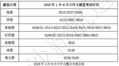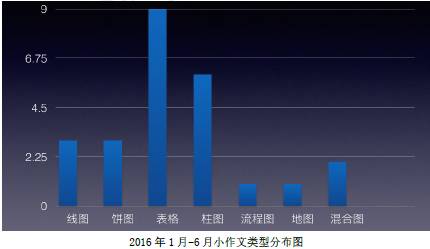 从个表格图可以看出,今年上半年小作文的主流还是数据类。2016年上半年总共25次(1月9日有A、B卷)的写作考试中,数据类占了23次,而非数据类图表,比如流程图和地图仅分别各占1次。非数据类的考核和2014年的全年13次以及2015年的全年12次相比,目前非数据类在考试中所占的比重有所减少(但不排除在下半年加大考核力度的可能)。