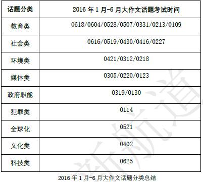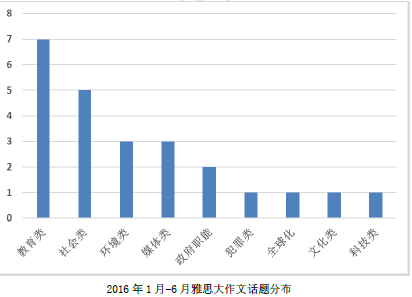 在2016年上半年的考试中,教育类和社会发展类话题仍然是重头戏(其中教育话题出现了7次,社会发展类出现5次)。 同样,环境类和媒体类以及政府职能也是不可忽视的重点话题,所以同学们下半年还是要充分准备相关素材。
